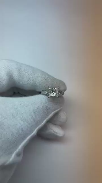 Spécifications de la pierre : il y a un diamant princesse dans le centre d'env. 2.50 carats (taille env. 7.8x7.8 mm) & environ. 2.30 carats de diamants sur le côté (taille env. 2.4x2.4 mm). Des diamants naturels extraits de la terre.