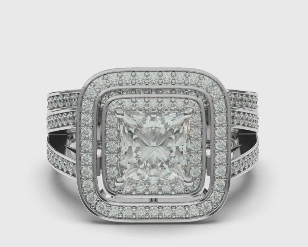 Spécifications de la Pierre : Il y a un diamant princesse au centre d'env. 1.50 carat & 0.82 carat de petits diamants sur la tige. Diamants extraits de terre naturelle.