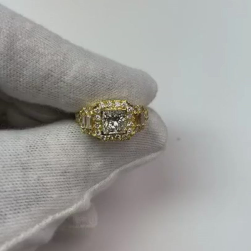 Spécifications de la pierre : Il y a un diamant Coupe Princesse au centre d'env. 1,50 carats (taille env. 6,2 x 6,2 mm), 4 diamants taille baguette sur le côté d'env. 0,25 carats chacun (taille env. 4,7 x 2,2 mm) et env. 1,50 carats de petits diamants. Des diamants naturels extraits de la terre.