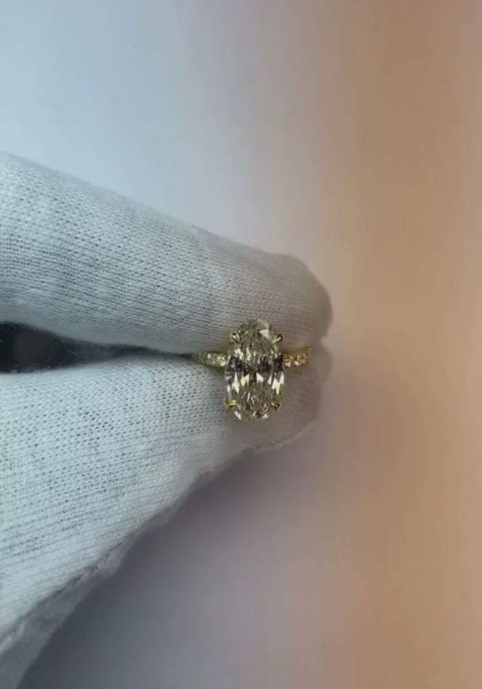Spécifications de la pierre : Il y a un diamant Coupe ovale d'environ. 3 carats (taille env. 9.8 x 7.8 mm) et plus petits diamants ronds sertis sur les côtés env. 1 carat. Des diamants naturels extraits de la terre.