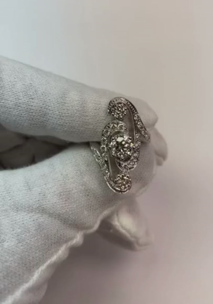 Spécifications de la pierre : Il y a un diamant ancien mine de Coupe Ronde d'approx . 1 carat (approx. Dia. 6,1 mm) et approx. 1,75 carats de petits diamants sur les côtés. Des diamants naturels extraits de la terre.