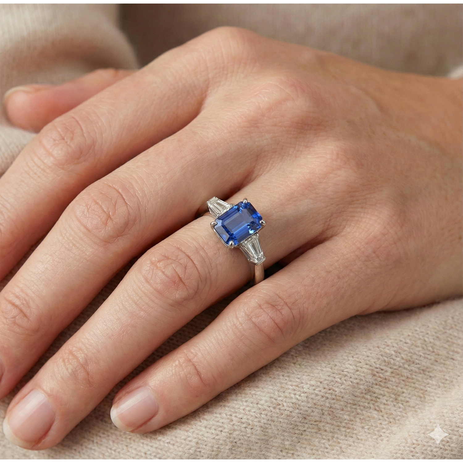 Spécifications de la pierre : Il y a une Coupe émeraude saphir env. 2.50 carats (taille env. 8 x 7 mm) et deux diamants baguette env. 0.25 carat chacun (taille approximative 4.7 x 2.2 mm) sur les côtés. Pierres extraites de terre naturelle.