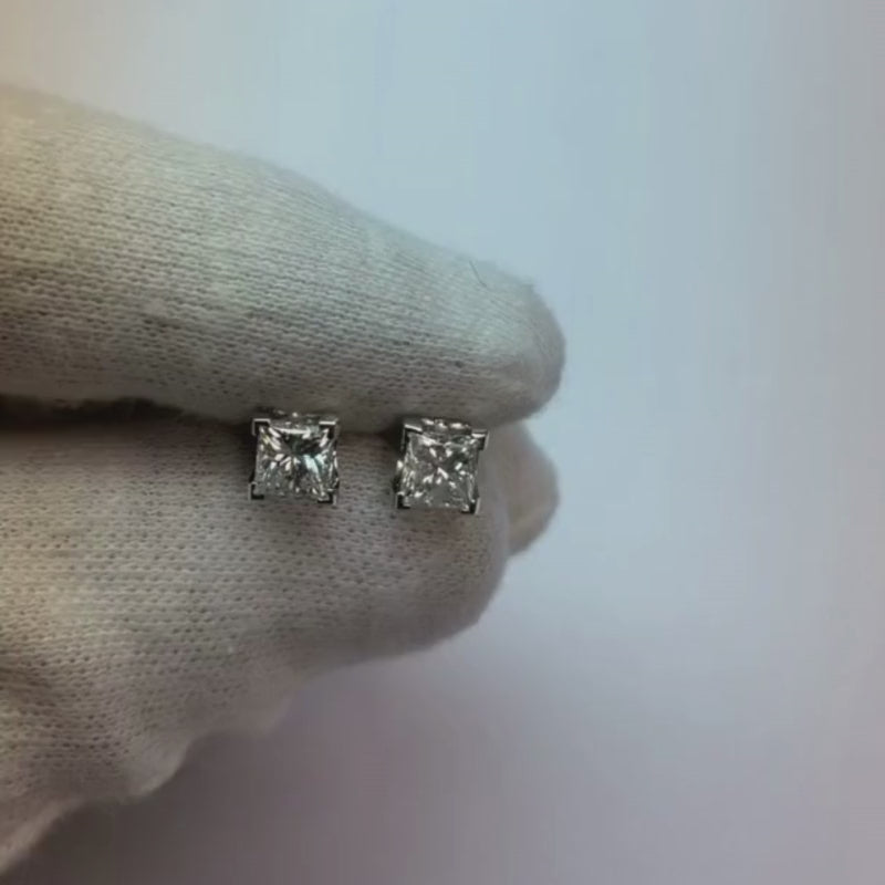 Spécifications de la pierre : Il y a un diamant Coupe Princesse d'env. 0.75 carat (taille approximative 4.8 x 4.8 mm) dans chaque boucle d'oreille. Des diamants naturels extraits de la terre.