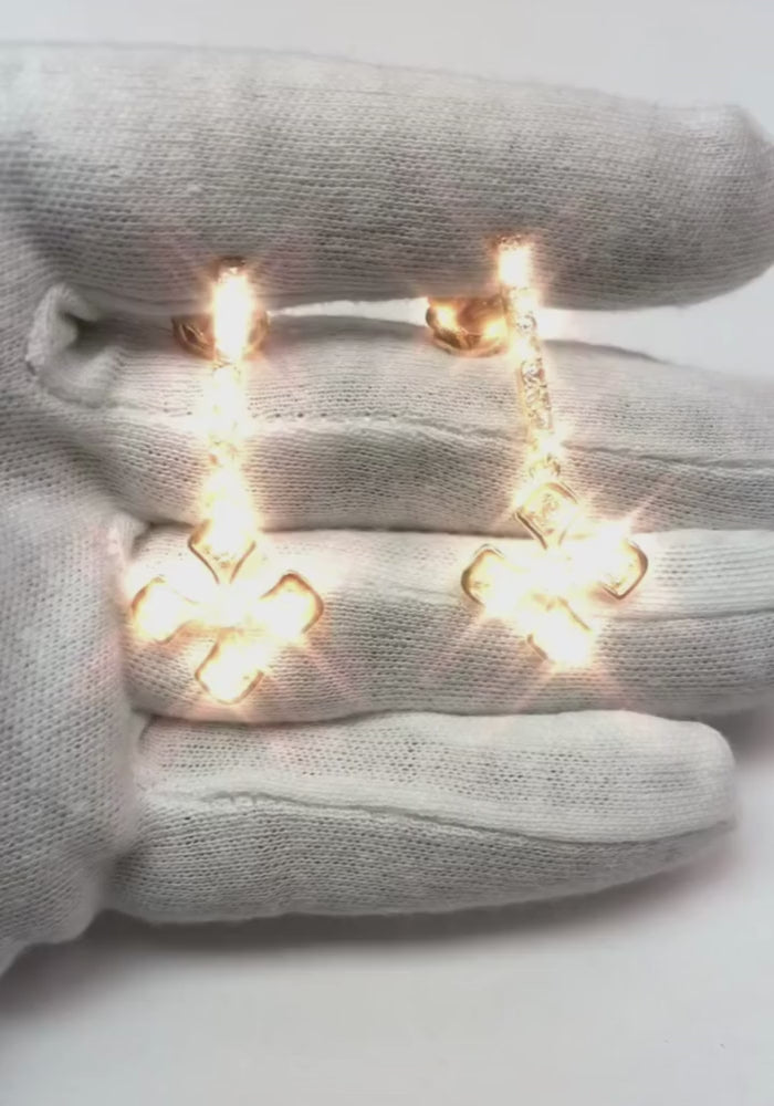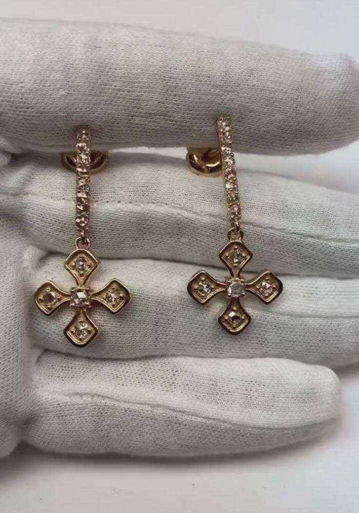 Boucles d'Oreilles Pendantes Diamant Croix Or Rose Taille Ancienne Femme Bijoux 2 Carats