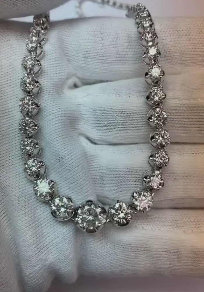 Spécifications de la pierre : Ce collier contient 1 diamant d'environ 1 carat (env. Dia. 6 mm), 2 diamants env. 0,75 carats chacun, 2 diamants env. 0,60 carats chacun, 2 diamants env. 0,45 carats chacun, 4 diamants env. 0,41 carats chacun, 6 diamants env. 0,23 carats chacun, 4 diamants env. 0,20 carats chacun, 28 diamants environ. 0,12 carats chacun et 46 diamants plus petits env. 0,07 carat chacun. Diamants extraits de terre naturelle.