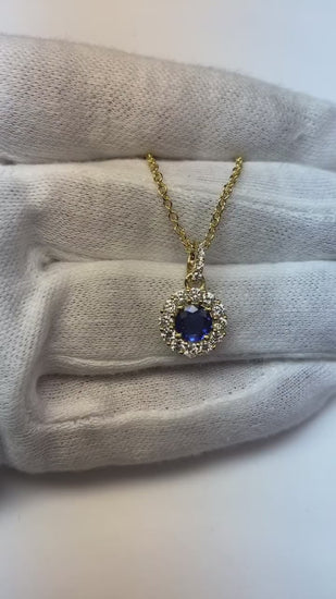 Collier Pendentif Saphir Bleu Rond 2 Carats & Diamant Or 14K