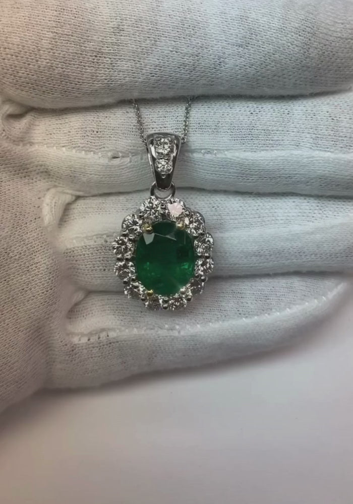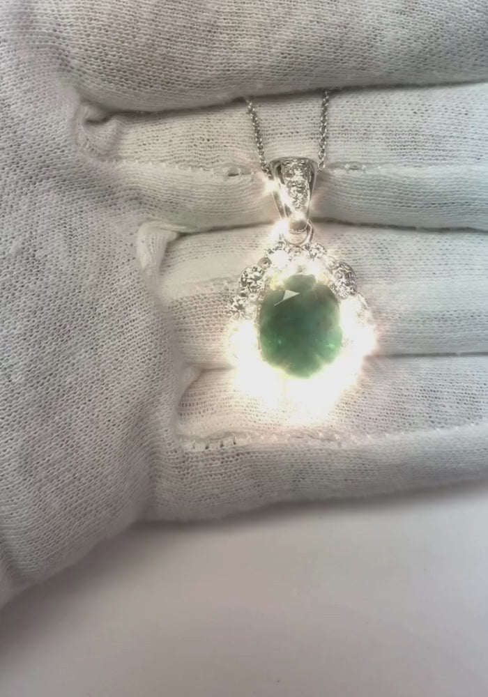 Collier Pendentif Vert Emeraude Avec Diamants 7.85 Carats WG 14K
