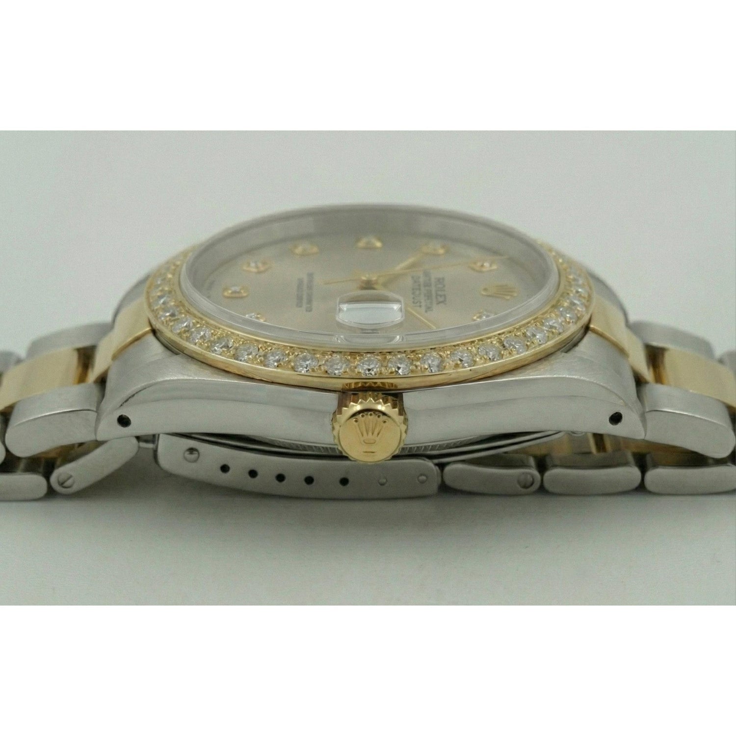 Modèle Rolex Oyster Perpetual Datejust. Cadran argenté avec index diamants. Lunette en or jaune 18 carats sertie de perles env. 1 carats de diamants de très belle qualité F VS1. Bracelet huître bicolore.